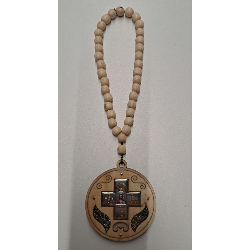 Чётки дерево светлое+круглая Божья Матерь+Николай Чудотворец+Иисус CH35
